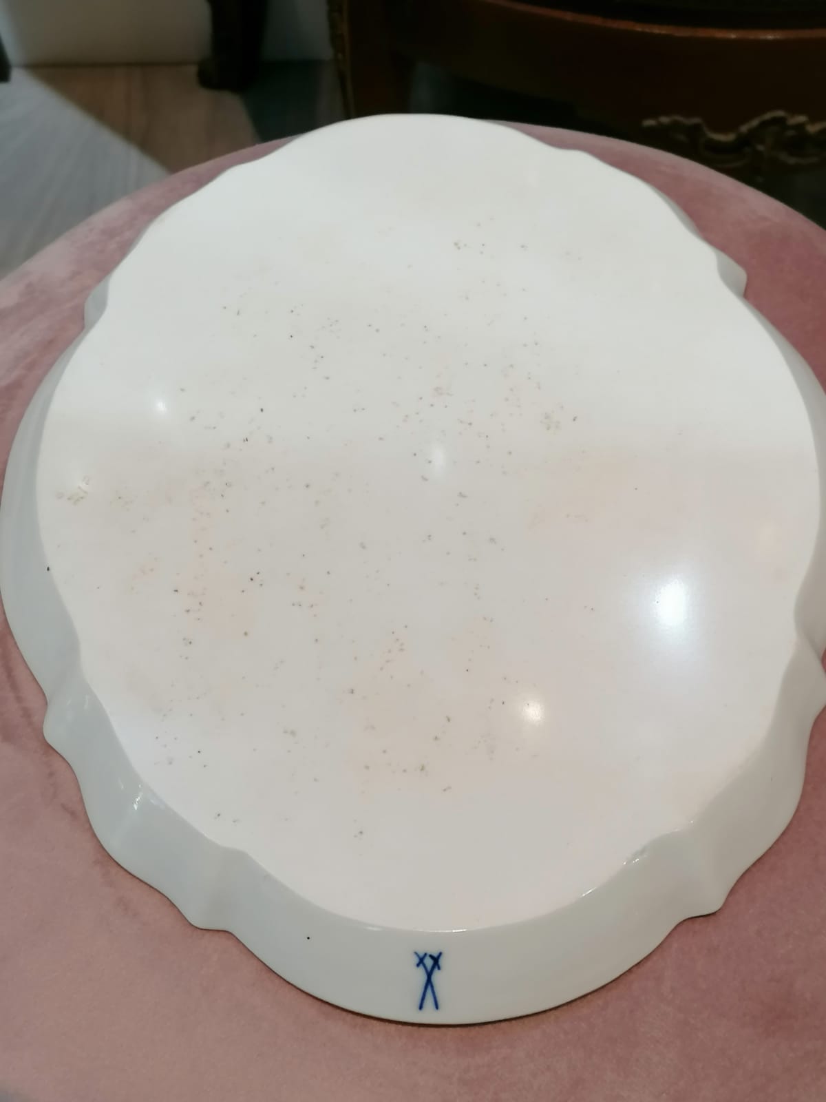 Oval platter with matching curves, Meissen, Pfeiffer period (1924-34), 1st choice, with polychrome floral painting, gold rim, l. 27 cm