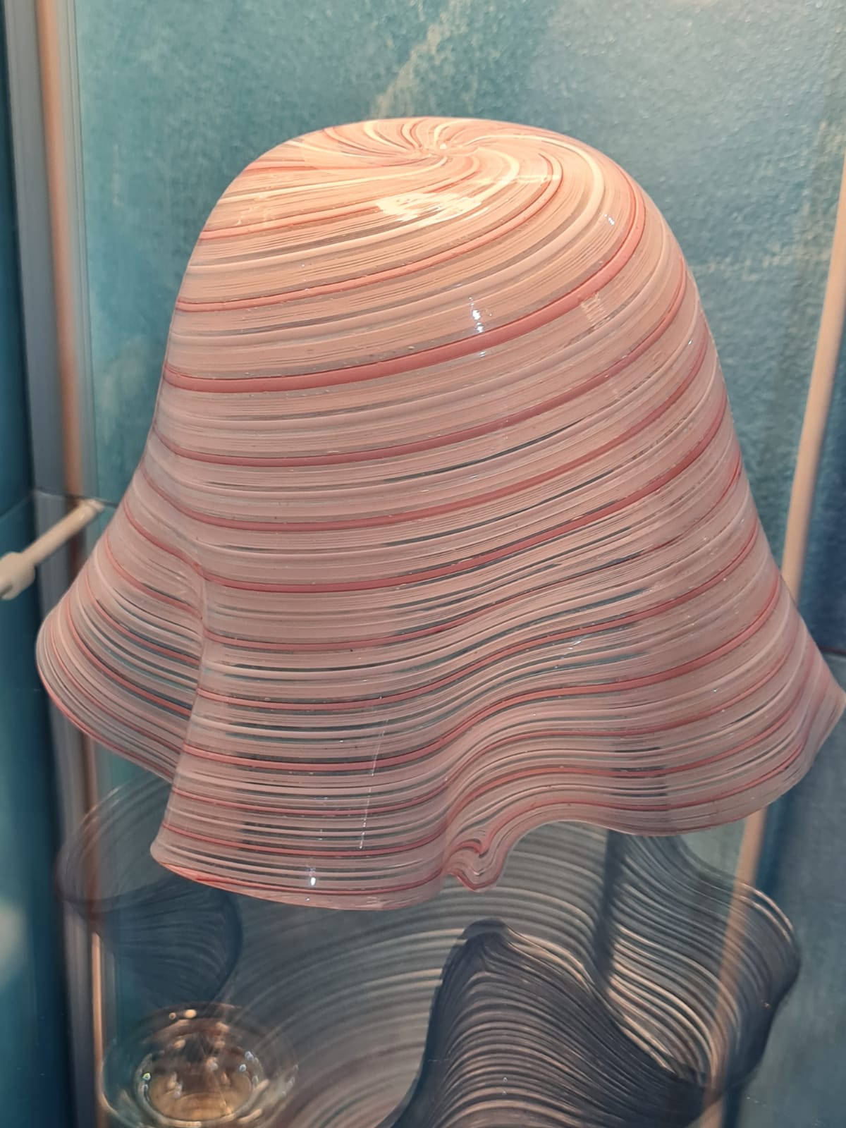 SALVIATI Handkerchief-shaped glass vase with pink and white stripes arranged in a vortex.