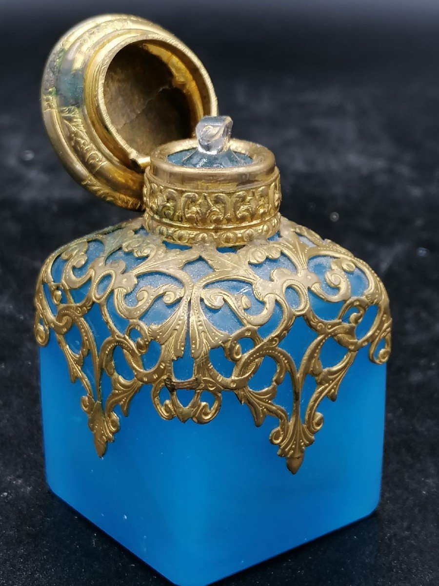 “Old Palais Royal Blue Opaline Glass Perfume Bottle With A Miniature Of Paris”
