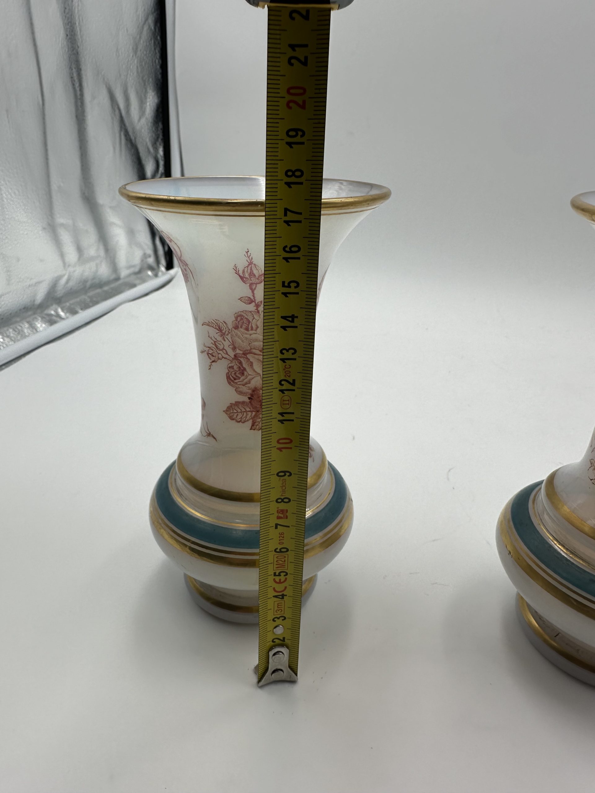 Paire de vases balustres en opaline blanche “bulle de savon” à décor de roses.